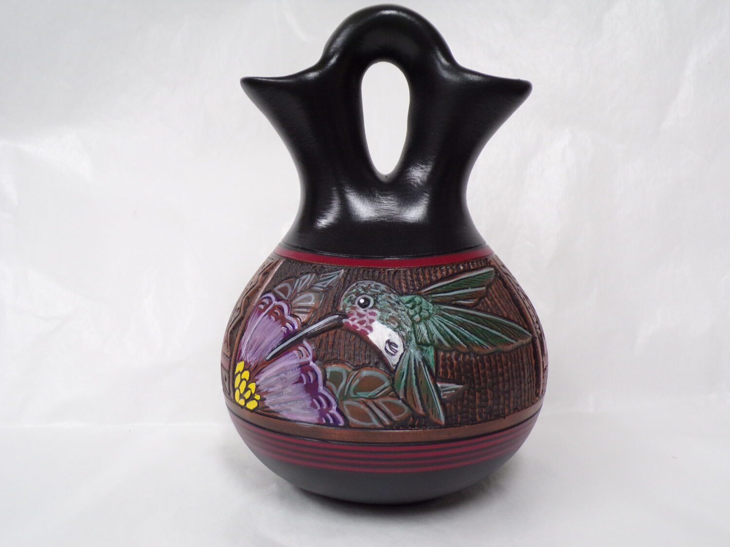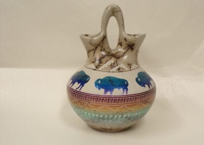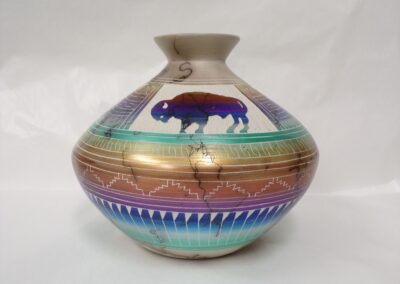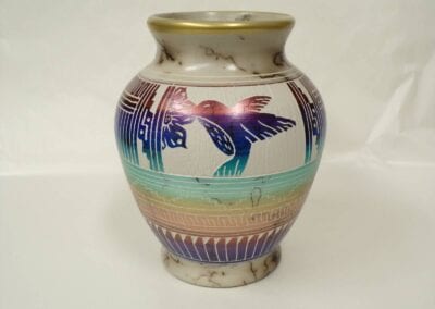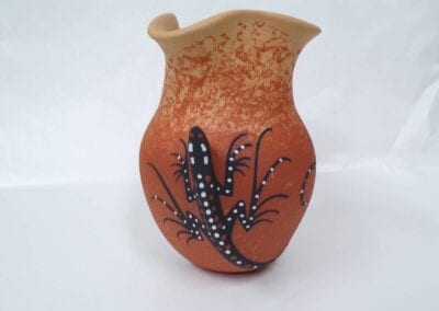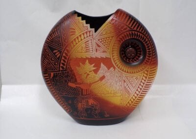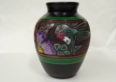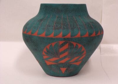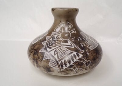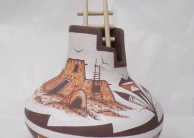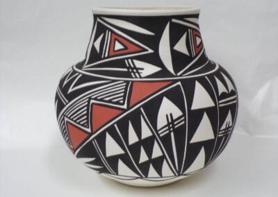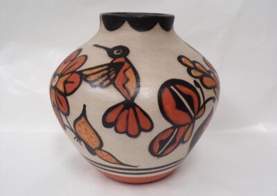 Born in 1972, Joseph Cerno Jr. is the son of Barbara and Joe Cerno, Sr. of Acoma Pueblo. Joseph learned the art of pottery making from his grandmother, Santana Cimmeron Cerno, and his father, Joseph Cerno, Sr. Joseph is an outstanding potter and painter of pottery as well. Joseph Jr. has followed in his parents footsteps who have had a long and illustrious career. This beautiful olla piece features the parrot motif which measures 9 high x 9 1/2 width.
